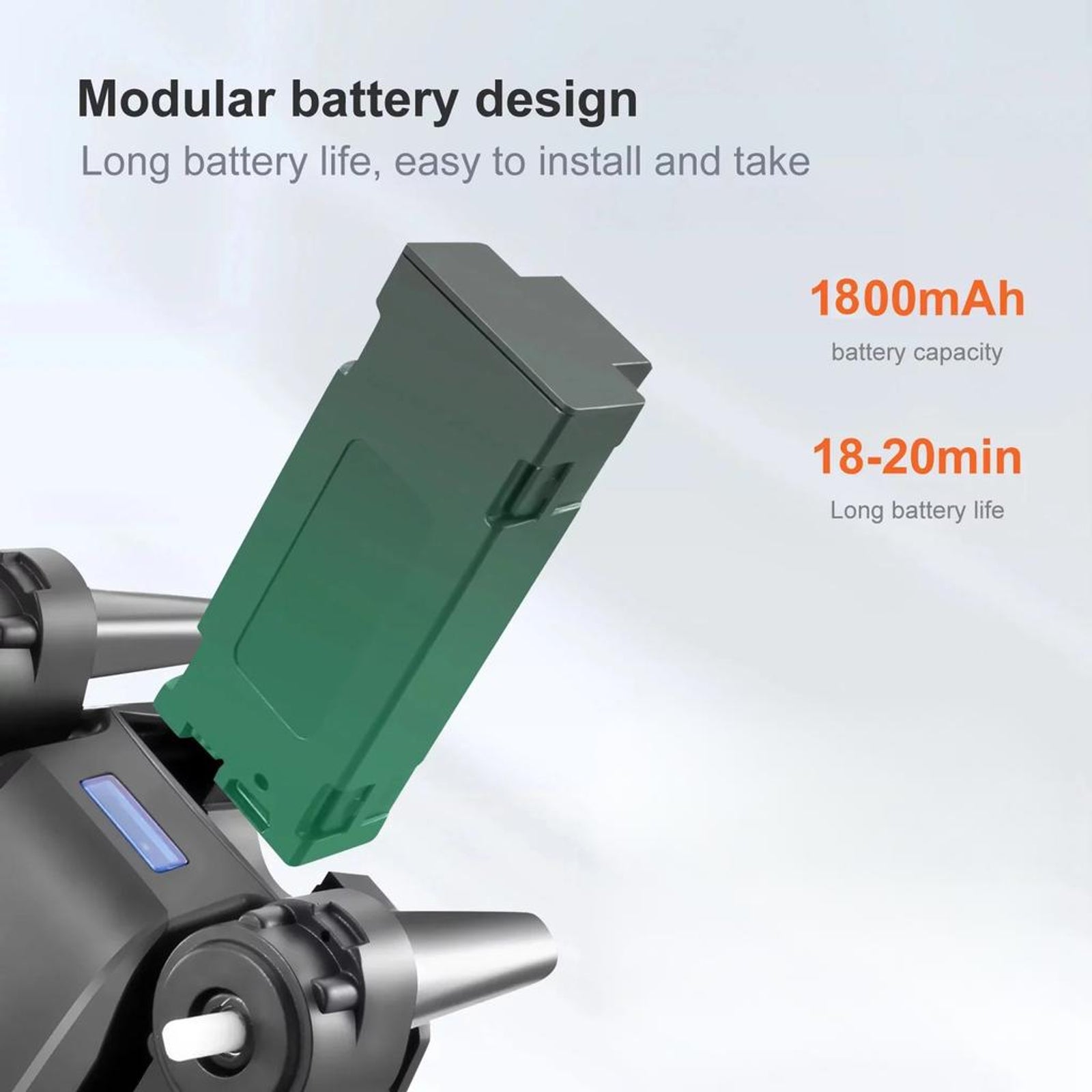 Includes two modular 3.7V 1800mAh batteries, delivering up to 30 minutes of total flight time (approximately 15–18 minutes per battery).